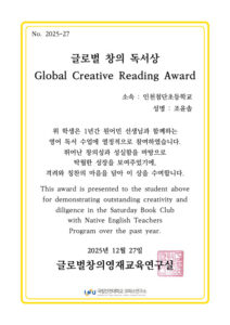 독서는 단순히 지식을 얻는 행위를 넘어, 넓은 세상을 이해하고 깊이 있는 사고를 기르는 마음의 밭을 일구는 일입니다. 본 연구실에서는 그간 독서 프로그램을 통해 창의적 사고를 함양하고 성실한 배움의 자세를 보여준 학생들을 격려하기 위해 <글로벌 창의 독서상> 시상식을 거행합니다.