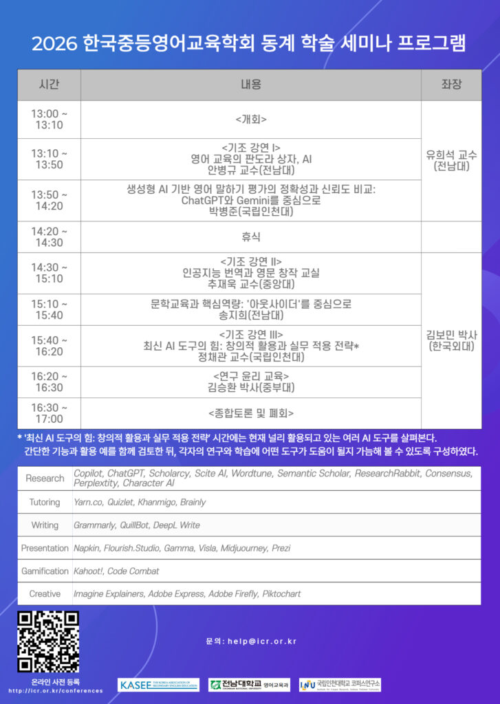 - 목적: 본 세미나는 생성형 AI가 중등 영어교육 전반에 가져온 구조적 변화를 성찰하며, 수업·평가·문학교육의 세 영역에서 요구되는 새로운 교육 패러다임을 모색하는 데 목적이 있다. 특히 AI 기반 도구의 활용 가능성과 한계를 균형 있게 검토하고, 교사의 전문성과 학습자의 인문학적 역량을 함께 강화할 수 있는 방향을 탐색한다. 이를 통해 기술과 인간 중심 교육이 조화되는 미래 영어교육 모델을 제안하고자 한다.