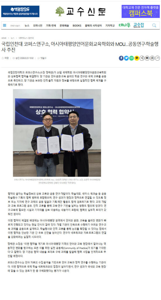 - 인천대 정채관 교수·현성필 영어영문학과 학생(일간투데이, 2021.03.22)